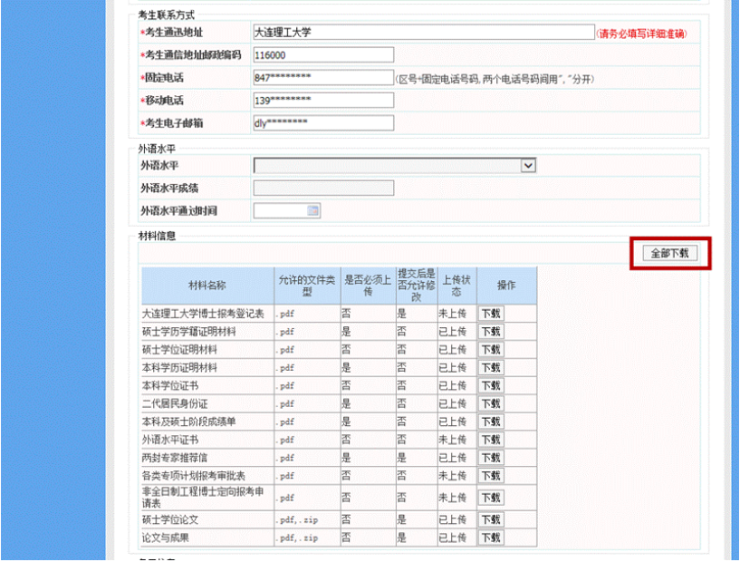 在考生报名信息页面材料信息部分点击“全部下载”,可下载查看考生全部报名材料。