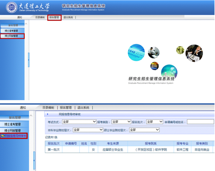 点击“报名管理”后,点击“博士网报管理”可查看本人名下博士考生报名情况