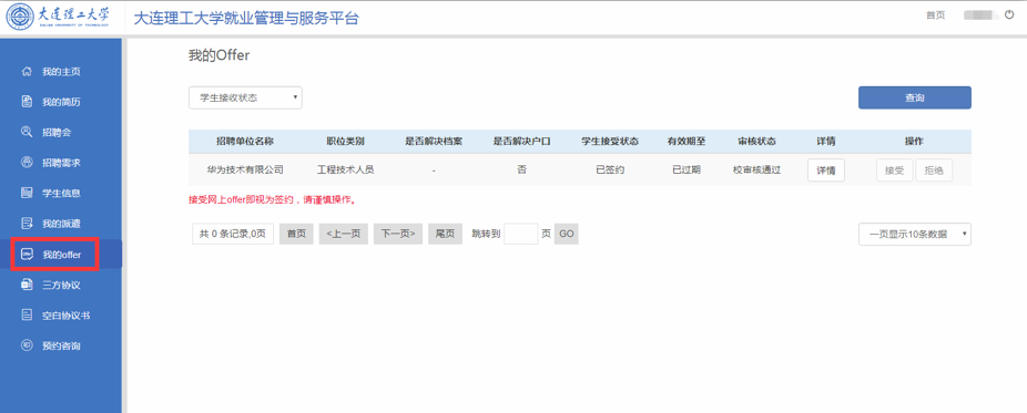 (3) 毕业生登录大工就业网,在“我的offer”中查看详情,确认点接收;*即使没有加盖公章,学生接收网上offer也视为签约,请谨慎操作。